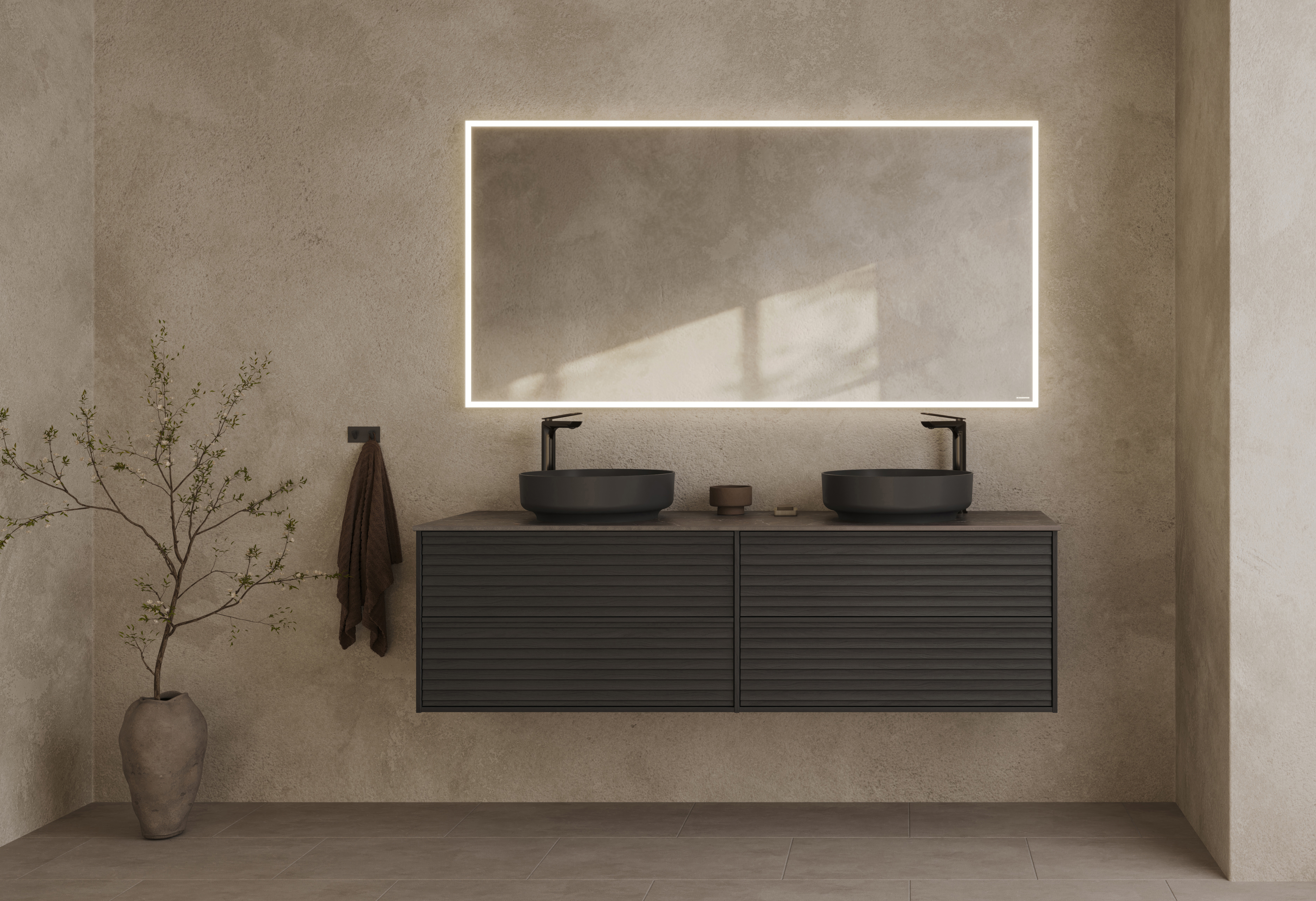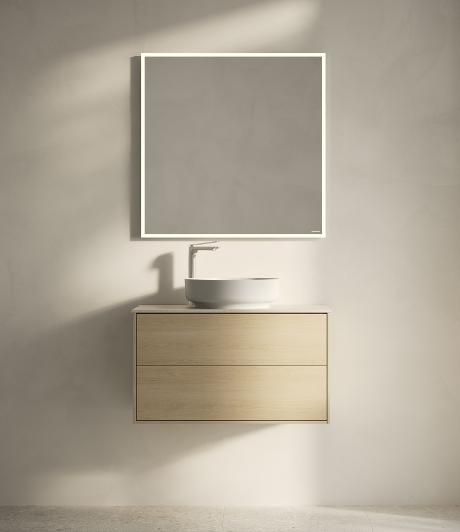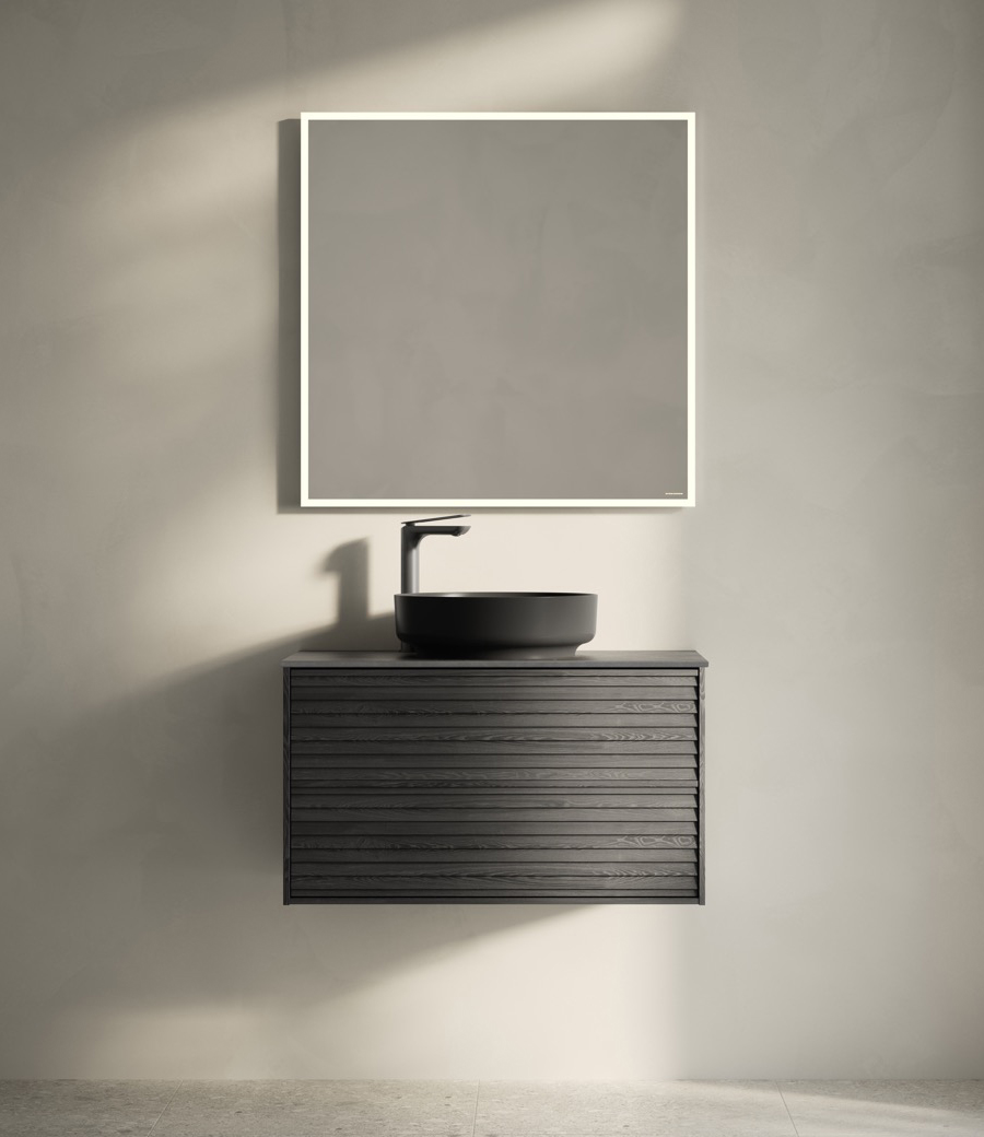 Grafisk design med elegant ramme. Med eller uden åben opbevaring. Bordplade og fritstående håndvask.