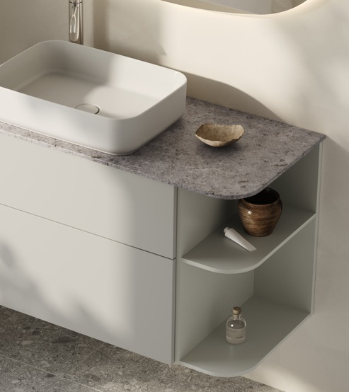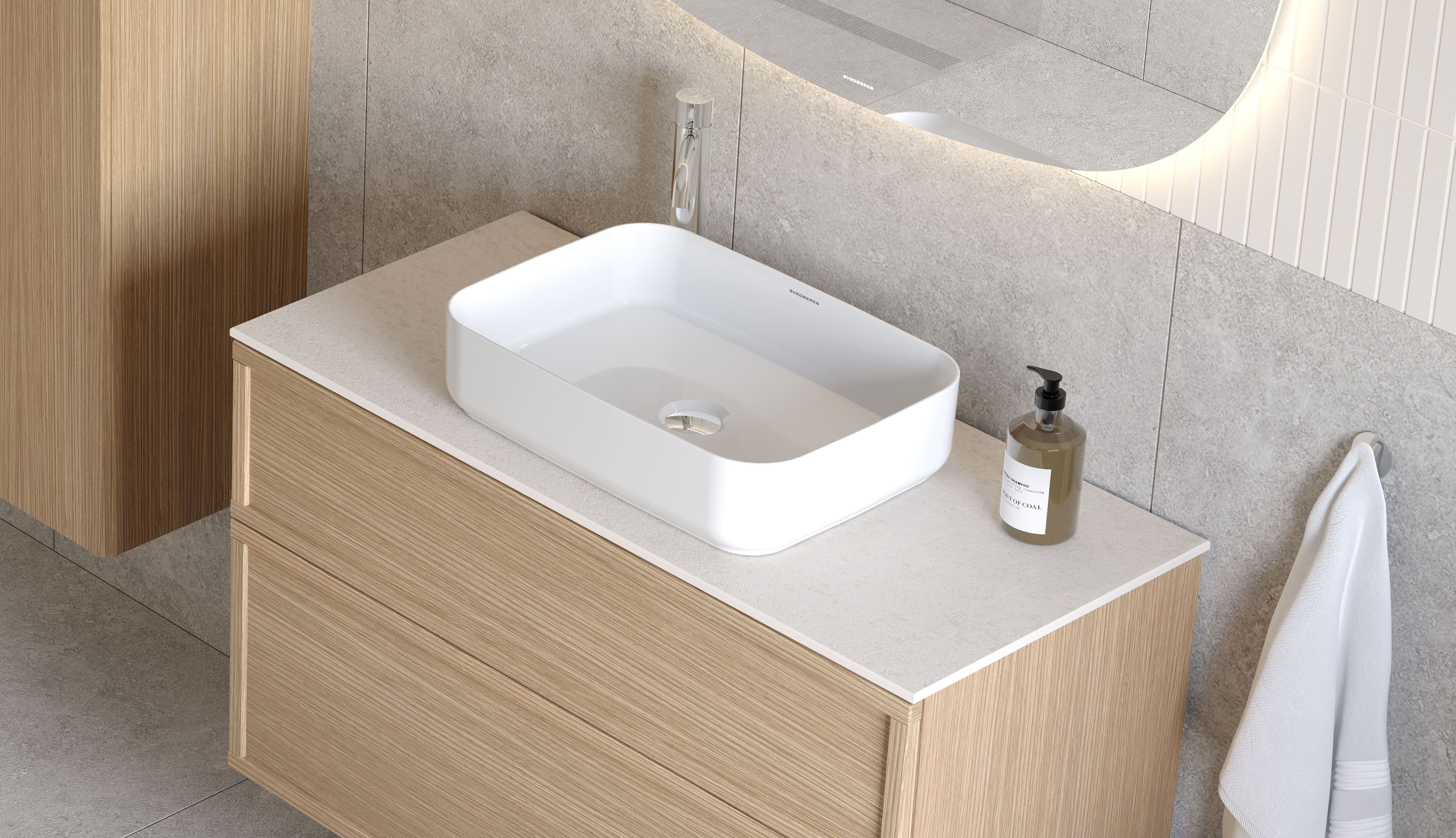 Poem Soft är en hyllning till det mjuka och tidlösa skandinaviska hemmet. Med rundade former, äkta träfanér och en jordnära färgpalett sätter kollektionen en varm och stilren ton i hela ditt badrum.